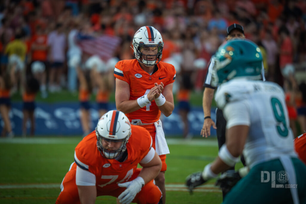 The Cavaliers wasted no time extending their lead after half-time, driving 60 yards in eight plays for Taylor’s second touchdown of the day—a 2-yard run—pushing the score to 35-0. Coastal Carolina finally got on the board midway through the quarter, as running back Ja’Vin Simpkins capped a 79-yard, 14-play drive with an 8-yard touchdown run. Kicker Kian Afrookhteh’s extra point made it 35-7—the Chanticleers’ only score of the game. Any momentum for Coastal was short-lived. On the ensuing kickoff, Ross fielded the ball at his own goal line and raced 100 yards untouched for a touchdown, electrifying the crowd and restoring Virginia’s 35-point advantage at 42-7. Morris exited shortly after a 28-yard scramble where he took a hit to his non-throwing shoulder, diagnosed preliminarily as an AC joint issue. Redshirt freshman Daniel Kaelin stepped in, completing his first career pass.